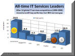It was IBM's third overall "gold" medal in the last 13 annual Octathlons, but the first in the current decade.  Accenture, on the other hand, retains the title as the most successful global IT services company since we started our Octathlons back in 1996, even though IBM has narrowed the gap and its lead this year (right chart).  HP placed third overall, followed by Capgemini and (the now defunct) EDS.