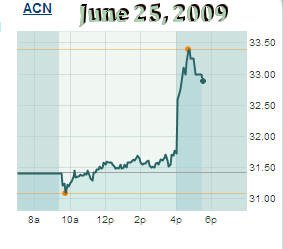 Updated 6/25/09, 2:30PM HITAnalysis of Accenture's Third Quarter FY09 ResultsRevenue, Earnings Drop...But Stock Rises 5% After Hours Despite the DeclinesHAIKU, Maui, June 25 – How do you turn a 16% decline into
