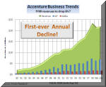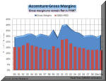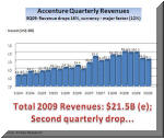 This trends is also discernible in Accenture's new business bookings (see right chart). While the new consulting contracts contracted by 18% in the quarter, the outsourcing sales thrived, rising by 24% during the same period. Overall, Accenture's new contracts declined about 2% from a year ago, less than the revenues or profits. "There is a major shift from consulting to outsourcing," confirmed Steve Rohleder, the company's COO, during a teleconference with analysts that followed the earnings release. But Bill Green, the company's CEO, said during the Q&A that it is too early to determine whether or not we are looking at trends here or "quarterly anomalies." He said that the systems integration work, for example, showed more stability than the "higher up the stack"-kind of consulting business. "So we are going to need another quarter to answer your question with conviction," he told an analyst. That's in part because during these difficult economic times, Accenture's revenues and profits were negatively affected by customers' contract cancelations or "rescoping" (reduction of contract values). So while the company showed its prowess at playing good offense (sales), it seems to have had more trouble keeping the business it had already sold in prior periods. In the systems integration and outsourcing business, "pricing has come under pressure because clients are continuing to ask us to go back and reevaluate our existing arrangements with them and reduce our prices," said Rohleder. "We've also seen some pressure in the ERP area, but quite frankly, the biggest volume is in our existing business" (ERP - Enterprise Resource Planning, typically SAP- or Oracle-driven applications). He said such "rescoping" (our term) has pushed Accenture more in the off-shore direction in order to service those clients (i.e., toward the lower labor cost markets). So while that trend doesn't impact the company's margins, it does affect the revenues, Rohleder added. Indeed, Accenture's operating margins rose to 14.2% in the third quarter, compared with 14.1% a year ago. Which is quite a feat from a management standpoint, given the 16% revenue decline during the same period. And the company's gross margin also improved to 32.5%, up a point from 31.5% for the third quarter of 2008. The increase was driven by improved overall outsourcing contract profitability, the company executives said. Summary & Outlook Looking ahead, Green, the CEO, sounded an optimistic note when commenting about the outlook for calendar 2010. He said he was hoping that the clients would start implementing the projects that had been put on hold during these difficult economic times. "If we can get a nice kick as people start the planning and work for the 2010 business... we think that's going to serve us well," he said. "That's all instinct at this point," he qualified his opinion. "But that's what we are seeing at this point in (our) client base." Accenture expects revenues for the fourth quarter of fiscal 2009 to be in the range of $5.0 billion to $5.2 billion. Which puts the company on course to end up the full fiscal year with about $21.5 of revenues, down 8% from the year before. And that's exactly what our forecast calls for as well. The company said it expects full year bookings between $23 billion and $25 billion and the EPS for the full fiscal year in the range of $2.67 to $2.70. The company’s previous guidance was $2.60 to $2.67. Which means that Accenture can deliver strong bottom line results even at a time when its top line comes under pressure, such as at this point in time in the marketplace, leading to its first ever annual revenue decline. Click on the following link to also check out some detailed tables...