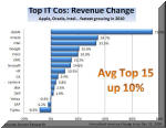 At the end of 2009, the Fluff Ratio for the top 15 IT industry leaders stood at 4.6. Now, it is down to 4.0. Partly, that's because the higher earnings that Wall Street was predicted have resulted in increased equities, which are up 16% since the start of the year. But also, by scaling down their expectations about the future, the investors are removing excess "fluff" from the market. Meanwhile, the industry's