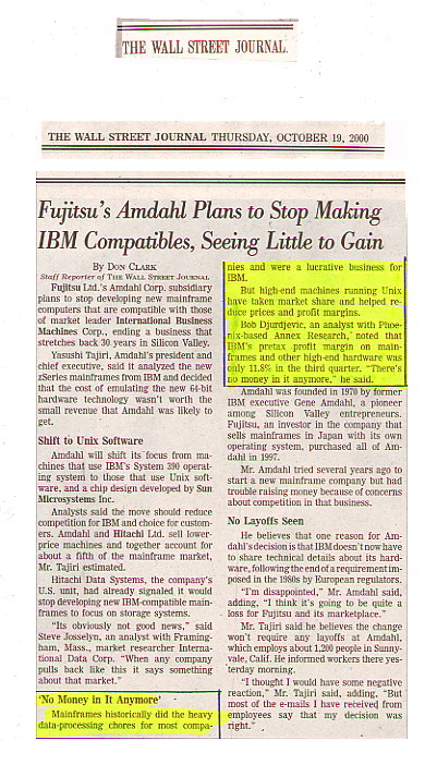 Columns| Activism | October 19, 2000 Fujitsu's Amdahl Plans to Stop Making IBM Compatibles Here's a story on Amdahl/Fujitsu that ran in the MARKETPLACE section of the Journal: