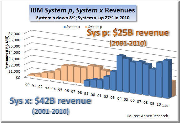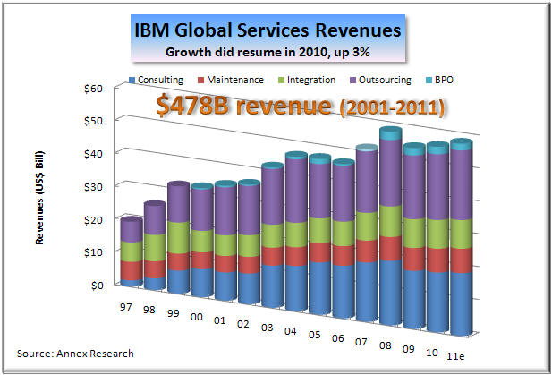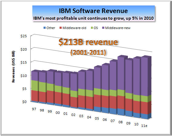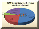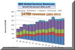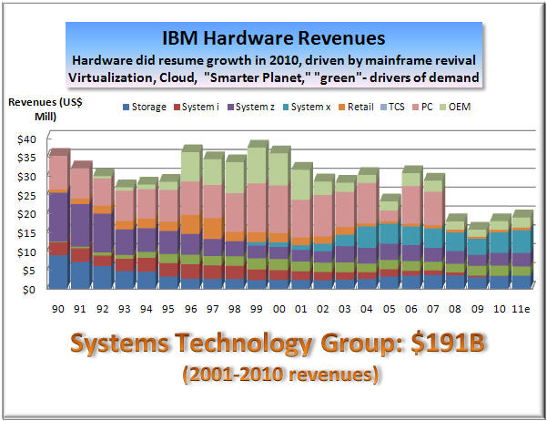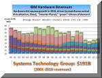 stock m Not only is IBM stock leaving its IT major competitors in the dust, it is also outperforming all major market indexes, including the Dow and S&P of which it is a part. In short, IBM has become a safe harbor, a model of stability, especially at a time of significant market volatility, caused by several Arab revolutions and major Japanese earthquakes. No surprise there (see IBM: Another Phoenix of the IT Industry and IBM Hardware to Rise and Shine Again). Business Segment Performance In 2010, all major IBM lines of business bounced back after a declining year in 2009. Mainframe revival led the server resurgence with a 69% jump in the fourth quarter, up 16% for the year (left). The System x also excelled with a 27% surge, while the System p revenues declined 8% (middle). As a result, IBM overall hardware did in double digits in 2010 (up 11%), just as we predicted at the start of last year when nearly all hardware lines were pointing south (see Big Blue Poised for Growth Again, Jan 2010 ). Furthermore, IBM Global Services, the company's largest business segment