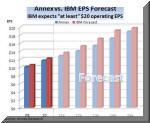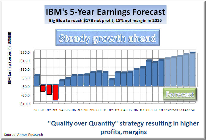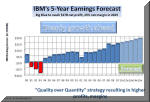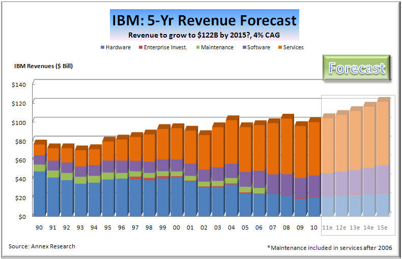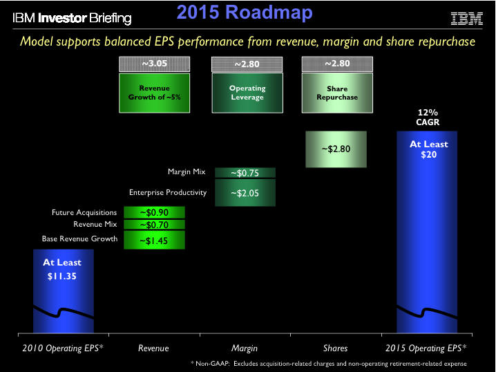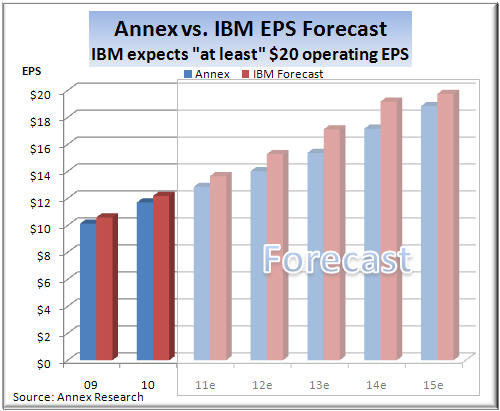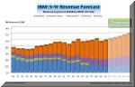 market was When IBM executives presented their "2015 Roadmap" to investment analysts last May, they spelled out in very specific terms not just what their objectives are, but also how they are planning to get there. The two left charts were a part of the presentation deck that the IBM CFO, Mark Loughridge, used at this session (see Big Blue Rains Honey on Wall Street, May 2011). The chart on the right compares out five-year forecast (blue bars) with that of IBM. As you can see from the right chart, we are not quite as optimistic as the Big Blue executive team, but nevertheless think that IBM will continue to grow steadily both its revenues and earnings. We think that by 2015, IBM revenues will be about $122 billion, and its earnings almost $19 billion. The main reason for our slightly lower forecast is that we don't think that IBM figured in any bumps on the road which we are all likely to hit over the next five-year period. And because about two thirds of the EPS gains come from a fairly nebulous "operating leverage" ($2.80), and non-operational stock buybacks ($2.80), with only about $3 attributable to revenue growth. So we expect Big Blue to grow its revenues at about 4% compounded annually between 2010 and 2015, while its earnings should rise 5% compounded annually. But IBM could accelerate these growth by cranking up acquisitions. So far, the company has fingered about $20 billion for it between now and 2015, while "reserving" about $50 billion for stock buybacks. If these figures were reversed, or at least brought closer into balance, IBM would have a much better chance of making its 2015 forecast of "at least $20 (operating) EPS." Either way, the company is poised for a ride up the market cap slope.