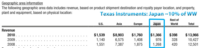 The reason we find this instructive is that TI and IBM derive about the same amount of business from Japan - roughly 10% of their global revenues (left chart below). We don't normally follow TI, but found it very interesting to learn that TI actually outperformed IBM and the market in the last six months. And as you saw from our recent analysis, IBM has done better than ALL of its major IT competitors in that time frame (see Wall Street's New "Rock of Gibraltar", Apr 12, and the right chart above). Which means that TI, an "old" company like IBM (TI is 75 years old), has beaten them all - the upstarts and the establishment players. Which is why it is instructive to see what they had to say yesterday about the future impact of the Japan earthquake. After all, so far, we have seen only about half a month's worth of it. Here's another excerpt from the TI teleconference with analysts (Apr 18):