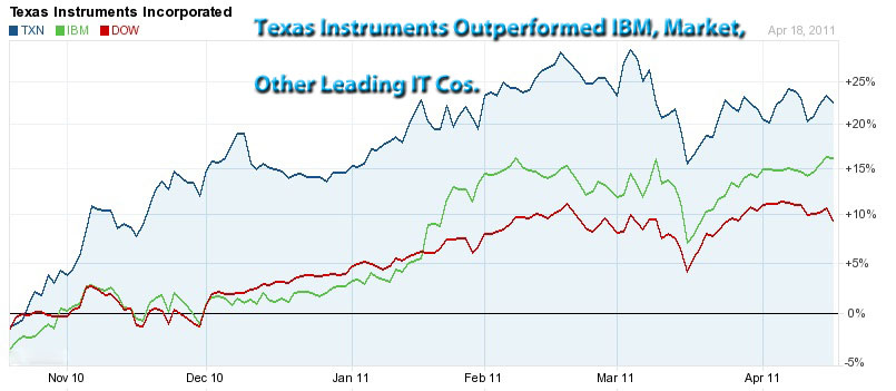 This market snapshot was taken in early afternoon New York time. While the market and major IT stocks were drifting downward, the Big Blue Rock was up. Since then, the IBM stock has moved even higher, dragging along the Dow and the S&P into positive territory as well. Market Update: TI, Japan ImpactHAIKU, Maui, Apr 19, 2011 - With an hour or so to go before we find out how IBM did in the first quarter of this year, the biggest question on this analyst's mind is the impact of Japan's earthquake. Texas Instruments yesterday became the first major company to quantify the effect of the Japanese disasters on its business. Here's what Kevin March, the TI CFO, told the analysts during the conference.
