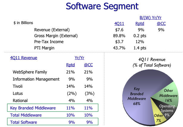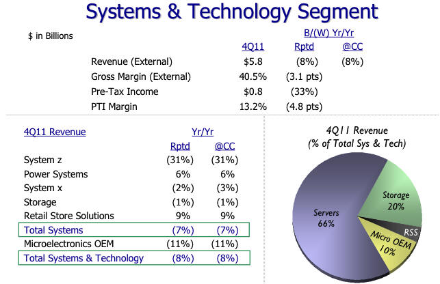Analysis - After the Earnings Releases: Why Wall Street Should Trust IBMOkay, let's put some more flesh on the bones of this story...I'll spare you the details. You can read how IBM did in individual product lines in any other business media story and see the charts below. I'll try to give you a high level view of why IBM deserves to be trusted in the future even though its shares have already outperformed the market in the last 12 months: