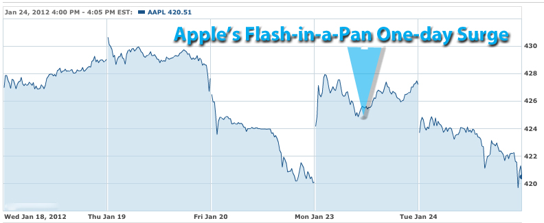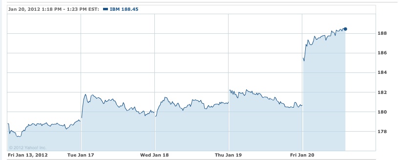 But the main reason, and the single overriding argument why investors should trust IBM is that the 100-year old company keeps reinventing itself practically every day of every year. Like life itself, this is a company in continuous motion. IBM of 2012 is vastly different company than was Big Blue of 2002, the year Sam Palmisano ascended to the position of CEO. Like everything else in the universe, you change one step and one day at a time. That's the secret to IBM's success. That is the reason the company has been outpacing the US GDP by almost two-to-one for over a century. "Sell on rumor, buy on fact." And now we know the facts behind the rest of the Big Blue story. Have a nice evening. Apple Earnings Go Through the Roof on Holiday iPhone Sales Apple Inc. reported this evening that earnings surged 118% for its first fiscal quarter, mostly on strong sales of the iPhone. For the period ended Dec. 31, Apple reported net income of $13.1 billion, or $13.87 per share, compared to net income of $6 billion, or $6.43 per share, for the same period the previous year. Revenue jumped 73% to $46.3 billion. Analysts were expecting earnings of $10.08 per share on revenue of $38.85 billion for the quarter, according to consensus forecasts from Thomson Reuters. For the current quarter, Apple projected revenue of $32.5 billion with earnings per share of $8.50, adding that the quarter includes 13 weeks. Analysts were expecting revenue of $32 billion with earnings per share of $8.02, according to consensus forecasts. Microsoft shares rise 2% after earnings meet expectations Microsoft reported a fiscal second-quarter profit of $6.62 billion, or 78 cents a share, on revenue of $20.89 billion. During the prior-year's quarter, Microsoft earned $6.63 billion, 77 cents a share, on $19.95 billion in sales. Analysts surveyed by FactSet Research had forecast the software giant to earn 76 cents a share on $20.9 billion in revenue. Intel reports 6% higher profit, exceeding estimates Intel Corp. reported a fourth-quarter profit $3.4 billion, or 64 cents a share, compared with its profit of $3.2 billion, or 56 cents a share, in the year-earlier period. Revenue rose 21% to $13.9 billion from $11.5 billion. Adjusted income was 68 cents a share. Analysts had expected the Santa Clara, Calif.-based semiconductor company to post earnings of 61 cents a share, on revenue of $13.7 billion. Google disappoints despite increase in earnings Google Inc. reported a 6% gain in fourth-quarter earnings this afternoon, missing Wall Street's expectations. For the period ended Dec. 31, Google reported net income of $2.71 billion, or $8.22 per share, compared to net income of $2.54 billion, or $7.81 per share, for the same period the previous year. Net revenue, excluding traffic acquisition costs, came in at $8.13 billion. Analysts were expecting earnings of $10.51 per share on net revenue of $8.43 billion, The Day After: "Buy on Rumor, But Even More on Fact"-Tactic HAIKU, Maui, Jan 20 - And now, here's what happened "the day after"... Wall Street loved what it saw and bid up both IBM and Apple shares. So "buy on rumor and sell on fact"-tactic did turn out to be appropriate this time around. Except, an option play is also "buy even more" on fact instead of selling. Just a thought... :-) As for Google, as a result of this perceived "miss," Google shares were off 8% in premarket trading on Friday after the Mountain View, Calif., web-search firm reported that fourth-quarter earnings rose 6% but missed analysts' forecasts. Google executives attributed the earnings miss to a number of factors, including foreign-currency translations and an impairment charge. Operating expenses also were heavy, up 35%, as the company added more than 1,000 staffers. On the upside, paid clicks -- the number of times Google users click on the firm's ads -- rose 34% in the quarter. Happy bargain hunting Bob Djurdjevic