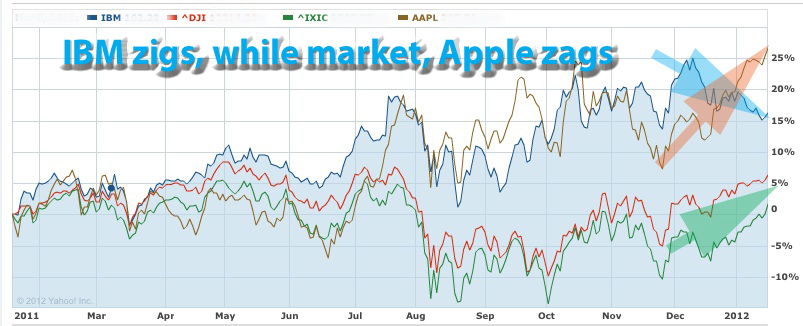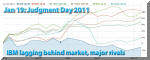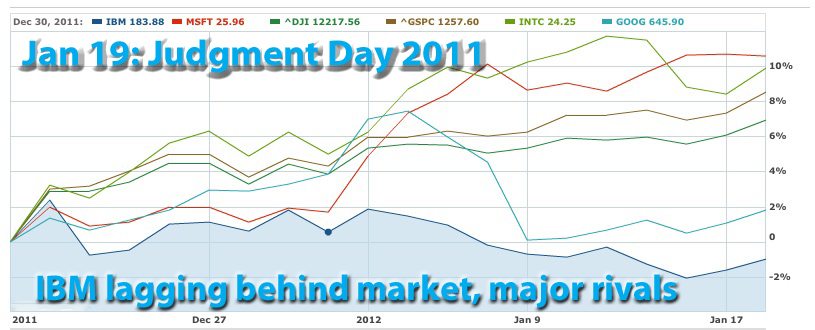 Updated 1/19/12, 10:00PM HSTAnalysis of IBM's & Other IT Leaders Fourth Quarter Business ResultsApple, IBM Clean Up, Google StumblesMeet new king of IT; Microsoft leapfrogs over IBM, Google also behindPreview - Before the Earnings ReleasesHAIKU, Maui, Jan 19, 2012 - Today, Jan 19, is "Judgment Day 2011" for five major global IT leaders. IBM, Apple, Google, Intel and Microsoft are due to release their calendar year 2011 business results after the markets close later today. When it comes to companies like IBM, typically, a good tactic at this point in the cycle has been "buy on rumor, sell on fact." Meaning, this would be a good time to sell, before the facts are known. Not today. IBM stock has been zigging lately while the market and its major rivals have been zagging. Take a look at the charts... Big Blue shares have declined since the start of the year, while the market and other IT leaders' have moved up. A full year comparison between IBM and the market can help explain the reason. The IBM stock has run ahead of the market in 2011, just as we noted in our early Dec 2011 analysis of the global IT leaders. So what has happened in the last six weeks or so is a "correction" to bring Big Blue closer line with the rest of the market. No such worries seem to exist on Wall Street when it comes to Apple. Like IBM, Apple had also run ahead of the market. But unlike IBM, Apple continues to do so, after a brief respite in November. Meanwhile, IBM's fundamentals seem as solid as ever. So we expect to see Big Blue shares rejoin other Wall Street leaders again in the near future. As a result, "sell on rumors, buy on facts" may be an appropriate stance today with respect to IBM stock. Here are some charts about the fourth quarter and the full year 2011...