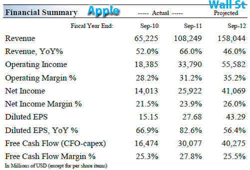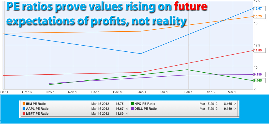 I This week alone, Apple shares have risen nearly 12% - more than double the amount the whole market appreciated for an entire year (2011 - Dow was up 5%). For the first two-and-a-half months of 2012, Apple shares are up 45%, Microsoft's 27%, IBM's 10%... lifting the Dow to a level 8% higher than at the start of 2012. That's sheer madness. Market values are rising based on FUTURE expectations not real earnings. The P/E ratios prove it. Apple's is 16.7, IBM's is 15.8, Microsoft's is 11.9, Intel's 11.60... while HP's and Dell's are 8.5 and 9.2 respectively. Analysts' gullibility or obsequiousness (to market and rich investors), take your pick, is also fueling the craze. I've picked just one of many reports circulating on Wall Street which predict that Apple can keep on rising like a rocket seemingly ad infinitum (right chart above). It can't. And it won't. Nothing goes up forever especially at the amazing growth rates that Apple's spurt has demonstrated in the last two years. To be sure,