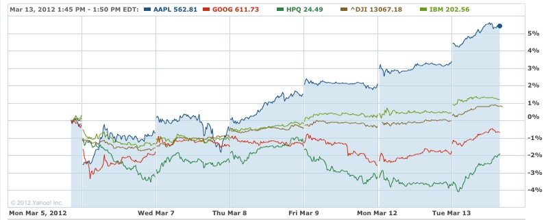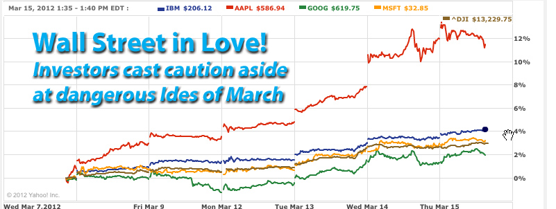 Updated 3/15/12, 9:00AM HSTApple Shares Go Through the Roof, Microsoft, IBM Follow, TooWall Street in LoveNo Signs of Caution on Ides of March, IBM Forecast Overshadowed by Wall Street ActionHAIKU, Maui, Mar 15, 2012 - Wall Street is in love! That's the only explanation we can offer for the market's completely irrational behavior. Investors have cast caution aside even on the auspicious Ides of March. "Beware of