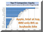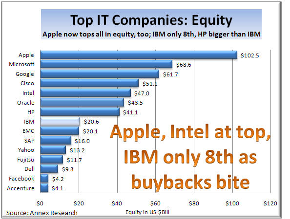 stock buybacks, for example, as many other com Think again. IBM is only 8th. Why? The company has been selling itself back to the shareholders since 1995. As a result, even the lowly HP is now double the IBM equity size, while EMC is about the same. So onward and upward once again toward the summertime earnings season...