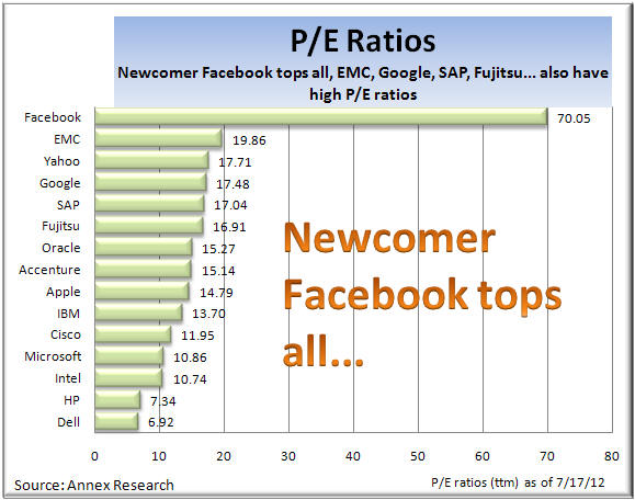 has already claimed the top spot with a P/E ratio of 70. That is, IBM and Apple are in the middle of the pack, while HP and Dell have the cellar locked up all to themselves with P/E ratios of only 7.34 and 6.92 respectively.