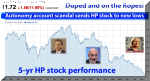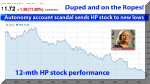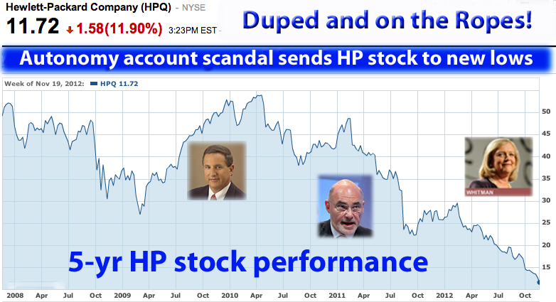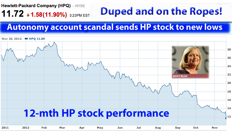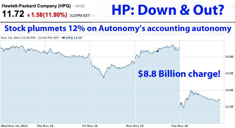 Updated 11/19/12, 11:00 AM HSTAnalysis of HP's Fourth Quarter Results & Stock PerformanceHP: Duped, Down and Out?Disclosure of Autonomy accounting fraud, $8.8 billion charge, sinks HP stock to new 10-year low; time to start writing a eulogy?