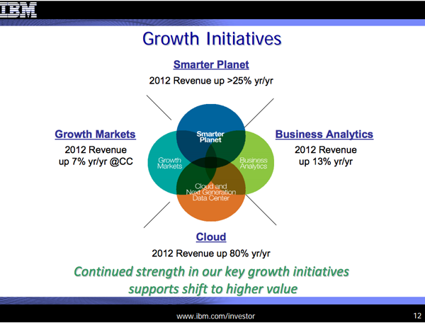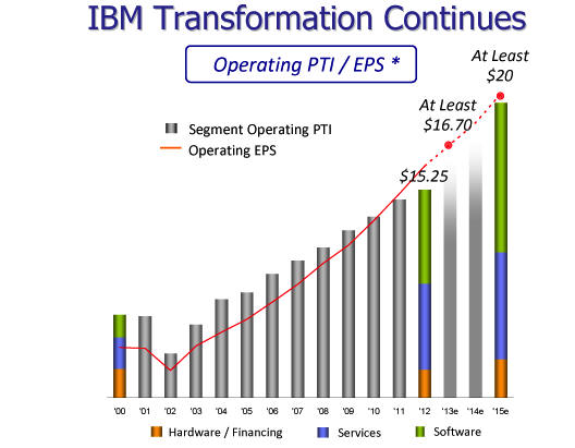 So what we are witnessing is a continuation of the "Quality over Quantity"-strategy that Sam Palmisano, IBM's former CEO, put in place in 2006. And the new CEO, Ginni Rometty, is evidently continuing. She is running IBM for the long haul not just quarter-by-quarter results. So don't expect IBM to set the world on fire as Apple did with its iPhone or iPad products. "Steady as she goes," or "boring but dependable" may be better attributes when one thinks of Big Blue. Here's an excerpt from what Ginni said herself about the latest results in a release: "We achieved record profit, earnings per share and free cash flow in 2012... We are well on track toward our long-term roadmap for operating EPS of at least $20 in 2015."