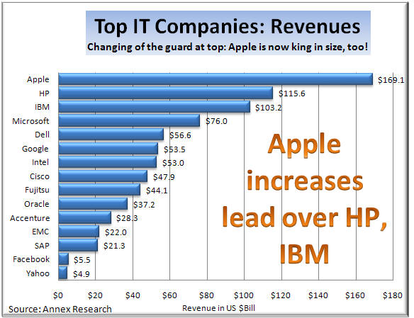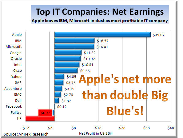 increased its lea Google and Facebook were the only Top 15 IT leaders that reported double digit revenue growth since our last report six months ago. Microsoft revenues also rose 5% as did SAP's. Which brings us finally to the bottom line - the net earnings. Apple is still the "king of the hill" in profitability with net earnings 21% bigger than the COMBINED net of both IBM and Microsoft. Obviously, this also means that Apple is making more than twice as much money than either IBM or Microsoft, the two next most profitable competitors. Google is now fourth, having surpassed Oracle. Intel is a close fifth. At the