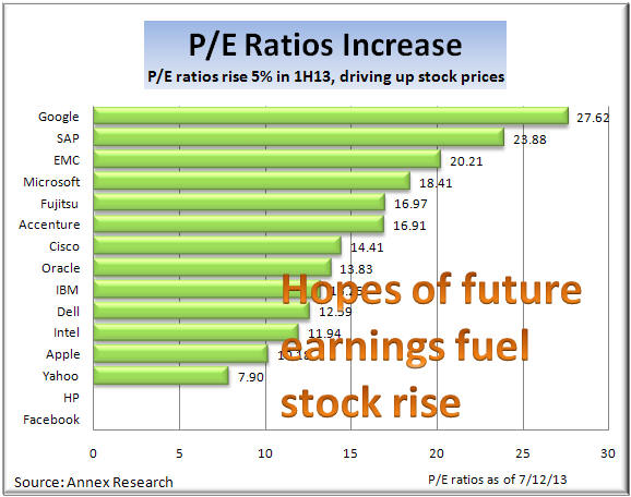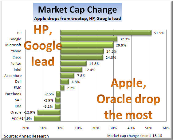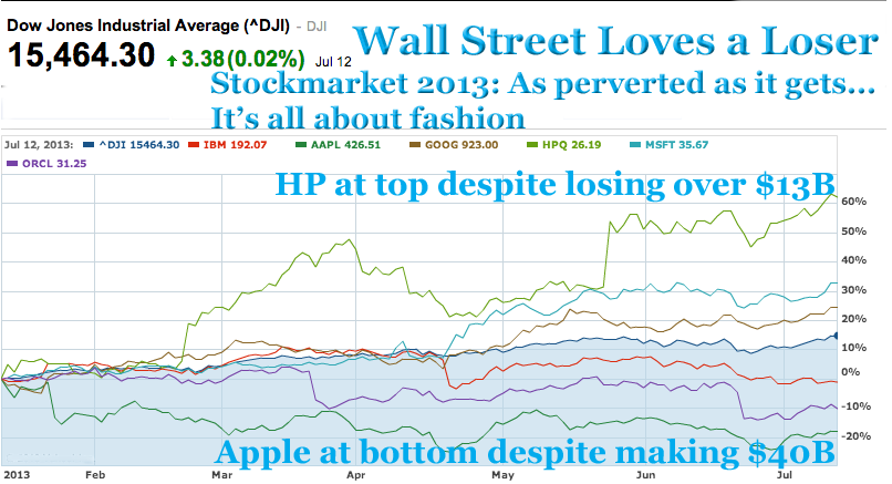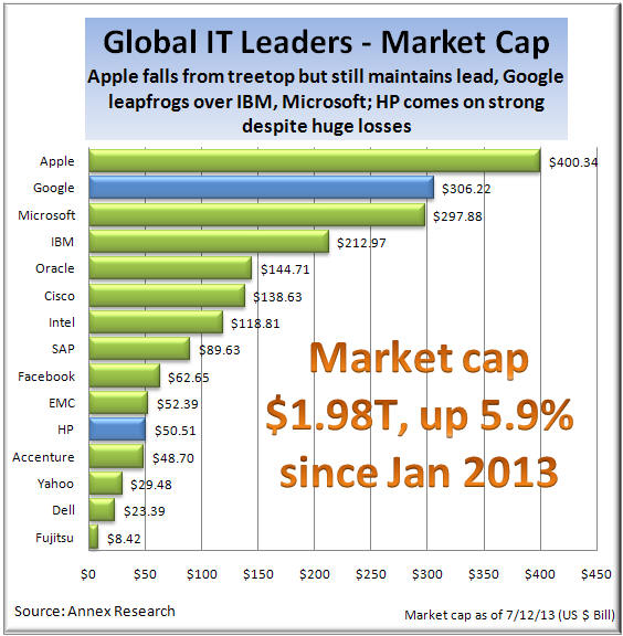 Updated 7/12/13, 8:40PM HSTAnalysis of Market & Business Performances of Top Global IT CompaniesWall Street Loves a LoserIt's all about fashion: HP stock tops all despite huge losses; Apple at bottom despite biggest profits;Google leapfrogs over IBM, Microsoft to #2 spot in market cap;Top IT Market Cap rises 5.9% in 1H13, mostly based on wishful thinking (higher P/E ratios); Profits down 1.6%; Revenue up only 2%HAIKU, Maui, July 12, 2013 - "Where ignorance is bliss, 'tis folly to be wise," Cambridge University professor and poet Thomas Gray wrote some 250 years ago. He must have been extremely prescient. Because his famous quote describes perfectly the current state of affairs on Wall Street.