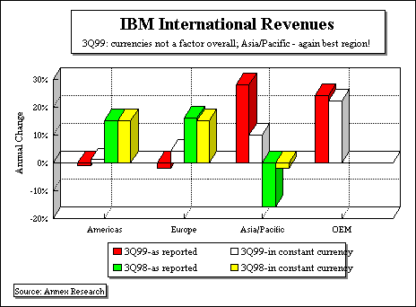 Software. IBM software segment also experienced good growth in the third quarter, particularly in the so-called "middleware" products. Overall, IBM software revenues increased by 7% to $3.0 billion, while the gross margins improved from 80.6% to 81.2%. But software pretax margins were basically flat - 18.8% in 3Q99 vs. 18.4% in the same period last year. IBM PC and Rentals and Financing units both experienced double digit growth (11%) in the latest quarter. But while the PCs lost $69 at the pretax level, the latter financing operation raked in $322 million, for the highest pretax margin by far of any IBM business unit (32.9%). Happy bargain hunting!Bob Djurdjevic NOTE: The print edition contains additional charts and tables not included here.