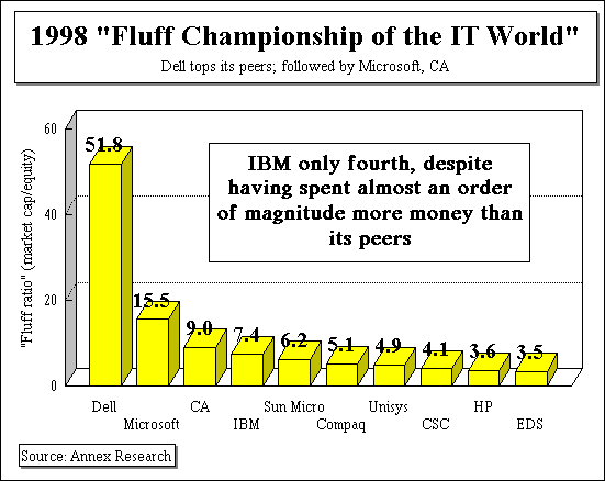 A "barbie doll" scam? What's that? It's the flip side of the "cabbage patch" fad. In fact, it is a complement to it. The "barbie doll" scam is the insider trading. At the same time as a company (IBM, for example) is BUYING back its shares, the insiders who are running it (!) are SELLING! In other words, it's financial incest. This week, for example, IBM's CEO sold 142,000 shares for a gain of about $16.6 million. Five months ago, Gerstner flipped another 138,000 shares for a $14 million profit. It should come as no surprise, therefore, that scores of IBM CEO's lieutenants followed their boss' lead down the path of greed. Of all IBM insider trades reported by Vickers Stock Research Corp. during the first half of 1998, 94% of the IBM insiders SOLD their shares. And that number is likely to go up when the third and fourth quarter insider trades are reported, as evident from Gerstner's last sale. Debunking Some Myths Defenders of the stock buyback scheme tend to cite three arguments in support of it. All are myths. Myth #1: Proof of management confidence. The first myth is that it is the proof of the company management's confidence in the value of its own stock. This week, a CNN financial reporter, for example, said as much as he read the news about the latest round of IBM buybacks. And he said it with a perfectly straight face. The reason we found such gullibility hard to believe is because it fails the "Logic 101" test. As you saw above, many senior IBM executives, including its CEO, took advantage of their own hype to SELL their stock options. And that's confidence? To be sure, any amount of buying, especially in the billions of dollars, does tend to push a stock up. Any stock. But that's an artificial boost; a scam just as if a home owner were to bid against other bona fide arms-length buyers to prop up the value of his own house. In other words, it's creating an illusion of prosperity. Furthermore, despite all the hype which the stock buyback fad has received, only about 20% of the publicly traded enterprises have exercised stock buyback programs. But since they are the 'household name' companies, like IBM, or GM, or Texaco, one gets the impression that the practice is more widely spread. Now, let's apply "Logic 101" again. If buying back one's shares were indeed a sign of management confidence, what are we supposed to believe, that conversely, executives in 80% of corporate America don't see the value in their companies? Of course, it doesn't mean that. It means that four-fifths of corporate America is still minding its business, rather than allowing itself to be distracted by the Wall Street buzz. Myth #2: Best use of cash. Another self-serving stockmarket myth is that Wall Street knows best how to invest your money. Such a theme was discernible from the various analysts' comments in the "Sound Bites" section of this Bulletin. Maybe it does. Or maybe does not. One thing is for sure, though: Every time your funds are funneled through Wall Street, the bankers take a cut. Which tends to undercut their objectivity in making such self-serving statements. Nevertheless, this myth is clearly selling well. As you saw in the Annex Bulletin 98-31 (8/13/98), the Wall Street's institutional holdings have soared from the 7% share of the total U.S. equities in 1950, to 48% in 1997, according to the New York Stock Exchange (NYSE) Fact Book 1997. During the same time frame, the share of the stockmarket equity held by the U.S. (Main Street) "households" has declined from 90% to 44%, despite a 8% compound annual growth between 1950 and 1997. As a result, the U.S. stockmarket equities broke the bank by the end of 1997, the global financial crises notwithstanding. They reached a record, $13 trillion level. Just to put things in perspective - that's 1.6 times the U.S. GDP. Back in 1950, their corresponding share was only 48% of the U.S. GDP, with the institutions accounting for a mere 3% of the economy. The result has been a loss of market power for Main Street, and a surge of it for Wall Street. As in any casino, it takes a sucker to enrich the "house" through the gambler's greed or gullibility. Myth #3: A variation on "best use of cash." "When a company repurchases shares on the open market it reduces the available pool of shares in the overall market," an industry analyst wrote to us this week in defense of the stock buybacks. "The capital is then freed up to invest elsewhere." Sure. IBM shareholders' capital is being "freed" to be invested by SOMEONE ELSE! So this is merely a variation of the Myth #2. Once again there is an underlying assumption that "Wall Street knows best" how to spend your money for you. As you saw earlier, about 80% of corporate America disagrees with that notion. The IT "Fluff" Championship Even closer to home, in the IT industry, stock buybacks are far from prevalent. We have just finished an analysis of 10 IT leaders from the various segments of the industry. Three are conglomerates (IBM, HP, Unisys); two are IT services vendors (EDS, CSC); two are software companies (Microsoft and Computer Associates); two are PC makers (Compaq and Dell); and one is a midrange systems provider (Sun Microsystems). Our objective was to determine which ones of these 10 companies have the greatest amount of "fluff" in their stock prices (i.e., market hype, or hot air - if you prefer). So we dubbed the whole exercise the "Fluff Championship of the IT World." And, of course, we used our "fluff ratio" (market cap over equity), among other financial indicators, to try to figure who the champ is. And the winner is... IBM? No. Hewlett-Packard? No. You're getting colder. CA? No. But now you're getting warmer. Microsoft? No. But warmer; almost there. Compaq? No. Now you're getting colder again. Well, who then? Dell! This Texas-based PC maker is the 1998 "fluff" champion of the IT world. Dell's "fluff ratio" was 51.8, meaning 98% of its $83 billion market cap was made up of "fluff," versus only $1.6 billion