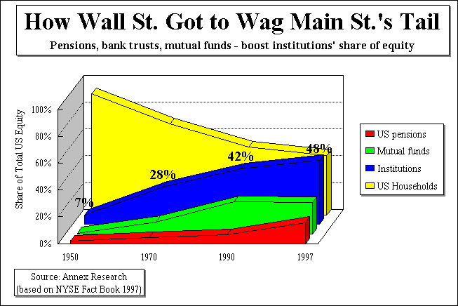 During the last three years alone, corporate America has spent nearly half a trillion dollars on Wall Street's virtual "cabbage patch" dolls - without creating a single new job or a product. Stock buybacks attracted more money in 1990-1997 than did the economies of all developing countries in the world - combined! (about $550 billion, according to a United Nations report - see Annex Bulletin 97-38, 10/16/97). "Sound Bites"... This week, stock buybacks shot back into the news headlines as the IBM board fingered another $3.5 billion for share repurchases, raising the cumulative capital authorized since early 1995 to $27.5 billion. Here are some "sound bites"... Bloomberg News Wire: "An Illusion of Prosperity." "Their (IBM's) fastest-growing business is services, and you don't have to build factories for that,'' an analyst at Brown Brothers Harriman & Co. in New York, who has a "short- term buy'' on IBM shares, told Bloomberg News Wire on Oct. 27. "You have to do something with the money.'' "It's a waste of capital - it doesn't create a single product or a single job," this writer was quoted as saying in the same story. The comment was followed by a Bloomberg footnote that, "(Djurdjevic) has been a longtime critic of buyback programs at IBM and other companies." Bloomberg added, "in the third quarter, Djurdjevic estimates that IBM's share buyback increased its earnings per share by 11 cents. 'It creates an illusion of prosperity by boosting the financial results without adding a cent to the bottom line,' Djurdjevic said." The New York Times: "A Wall Street Perversion." Meanwhile, the New York Times quoted on Oct. 28 an analyst with Merrill Lynch & Co, as saying that, "I think it's a reasonable use of cash. How many investment opportunities do they have that can return cost of capital? They should be investing up to that point, and beyond that they should return cash to the shareholders.""But Bob Djurdjevic, president of Annex Research, called the repurchase a 'Wall Street perversion,' that benefits selling institutions to society's detriment, and artificially inflates current earnings and growth," the Times said. "IBM has already spent several small countries' GDPs on share repurchases - $23 billion and counting - without creating a single product or a single job," he said. "It's a signal they don't have the imagination or creativity to employ the capital more productively." Dow Jones Newswires: "Paying Off Wall Street." "They generate a substantial amount of cash flow, and earning interest (on the cash) just isn't a good solution," a Gruntal & Co. analyst told the Dow Jones Newswires on Oct. 27. "Buying back stock is just one weapon they use to enhance shareholder value."By contrast, the Dow Jones wire quoted "the publisher of the Annex Bulletin in Phoenix and frequent critic of IBM's buybacks," as saying that the program "demonstrates a lack of creativity." "They're saying they can't think of a better way to invest in the (technology) industry," Djurdjevic said, adding that he is opposed to stock buybacks in general. "Instead they are paying off Wall Street (in exchange for) good opinions of IBM's stock." Why Buybacks Are a Scam So there you have it: a real conundrum, it would seem. Actually it is not. It is a scam. And here is how it works... Let's suppose a CEO of a large publicly-traded company happens to be voted into office thanks to support from the large, publicly-traded Wall Street institutions. Let's suppose he does well, and turns a moribund company around. Then the time comes for him to pay back his sponsors. So what does he do? Increase the dividends? Nah... of course, not. That way ALL shareholders, not just Wall Street institutions, would benefit from it. Instead, the CEO and his Wall Street cronies cook up a scheme called stock buybacks. The CEO's company repurchases (tens of) billions of dollars of its shares, mostly from the Wall Street institutions, of course, which account for a giant share of the trading volume, compared to the "Ma and Pa" investors. By a miraculous coincidence, most "respected" Wall Street analysts start hailing the CEO's stock as the greatest thing since sliced bread. (Some examples of such a hype were shown in the "Sound Bites" section of this Annex Bulletin). So the "Ma and Pa" investors (as well as some uninitiated institutional players) pump billions of additional dollars into the CEO's company stock, pushing up its market value to record levels. Now, from a hypothetical to a real world example... In IBM's case, despite its mediocre fundamentals, and a recent warning by its CFO to analysts NOT to increase their profit estimates for 1998 (see Annex Bulletin 98-36, 10/20/98), the Big Blue's stock kept setting all-time highs nearly every day of this week. Unperturbed by this dichotomy, Wall Street analysts continued to trip over each other to recommend this grossly overpriced stock to their investors as a "buy." Which leads to a fairly obvious question: Are they stupid or bought? (We'll let you decide on that). The Washington Scam By the way, American taxpayers could also be asking the same question about the Washington politicians: Are they stupid or bought? For, just as our above hypothetical CEO took the money from IBM's general shareholders so as to share it with his Wall Street cronies, so do many of our politicians. They take our votes and our money to bail out Wall Street bankers. Think the $40 billion-Mexico bailout; the $140 billion-and-counting Southeast Asia bailout; the $20 billion-Russia bailout; the upcoming $30 billion Brazil bailout... (see "Wall Street, Not Mexico Bailout," Annex Bulletin 95-08, 2/02/95). Put it all together, and what we're seeing is the birth of new global taxation system; the new "socialism international" whose main beneficiaries are the Wall Street "vulture capitalists," and the main victims western taxpayers. Worst of all, it's a new form of "taxation without representation." In fact, even the corporate sharehol