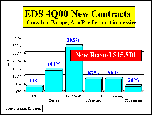Its Promises Record New Contract Sales Mark End of a Gangbuster Year PHOENIX, Feb. 7 - Back in April 1999, Electronic Data Systems (EDS) uncharacteristically invited analysts and investors to a face-to-face tête-à-tête in the plush New York Stock Exchange boardroom, at the very heart of Wall Street. Dick Brown, EDS's then new CEO and "change agent," told the assembled crowd that, "our real goal is to re-ignite the growth engines" (see Annex Bulletin 99-20, 6/26/1999). He then set the bar by which Wall Street should measure his goals. Today (Feb. 7), Brown delivered on his promises. No longer a new CEO, and now a proven “change agent,” the EDS chairman spoke calmly and confidently about the just-released fourth quarter business results. “We have achieved all three goals that we set out for ourselves” at the NYSE boardroom meeting, Brown said. · The so-called “organic” base revenue growth (growth adjusted for currency changes and one-time events) is at or higher than the industry growth rate (16% vs. 13%). · EDS has just exceeded the 10% operating margin (10.5% in 4Q00). · Earnings per share are growing faster than revenue (19% vs. 10% “organic” growth in 2000). Flashing back to the NYSE boardroom, Brown summed up his end objective back in April 1999 by saying, "we won't be satisfied until we regain the leadership position in the industry we founded." Well, EDS still has a long way to go before reclaiming the poll position in the IT services industry from IBM, but the company did outsell the Big Blue in the fourth quarter. And by a country mile. EDS reported $15.8 billion in new business sales vs. IBM’s $12.5 billion. It was EDS’s eighth consecutive record quarter.