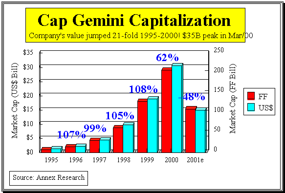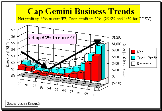 About five-sixths of the revenue growth, and over half of the profit increase, was attributable to the E&Y acquisition that was completed in late May 2000. Adjusted for the full year’s E&Y results, the CGEY growth was more moderate, but still in double digits. Revenues were up 10% (in euros/FFr), while net profit jumped by 26% (in euros/FFr).