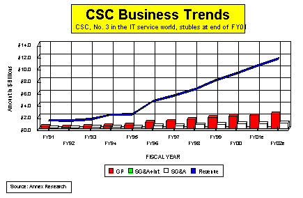 “We’re ahead of last year’s major new business award pace,” CSC’s chairman Van Honeycutt boasted in a Feb. 5 release. Nevertheless, that left CSC, the No. 3 IT services competitor, well behind No. 1 and 2 companies - IBM and EDS - which signed $56.4 billion and $32.6 billion respectively in new business last year. The tone at the CSC Mar.19 teleconference was decidedly less boastful and more subdued. An upturn in consulting and systems integration operations may not occur until the second half of next year, Honeycutt said. As a result, the company expects a FY02 revenue growth rate of only 13% to 15%. That’s a considerably drop-off from the 21% compound annual growth rates CSC chalked up in the last 10 years, which made it the fastest growing among the top five IT services companies (see “IT Services Heptathlon,” Annex Bulletin 2000-11, 4/17/2001).