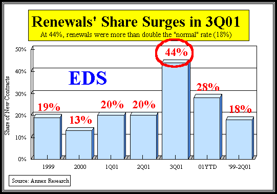 Strong Renewals Another thing that stood out in EDS third quarter results was renewals, usually a good indicator of the quality of service customers receive. “Our renewal rate with existing clients has reached unprecedented levels,” said Brown. Indeed, the third quarter renewals accounted for 44% of the new contract sales, according to Myrna Vance, the company’s top investment relations officer, more than double the normal rate in the last two years (see the chart). As a result, we estimate the EDS backlog to be now about $86 billion (about four times its revenues) and growing steadily. So all around it was a very good quarter for EDS, the company on a roll that keeps on ticking, like the Energizer Bunny, no matter what hurdles it or its customers and competitors face. So stand by for the EDS stock to rise in the wake of these results. Happy bargain hunting! Bob Djurdjevic |