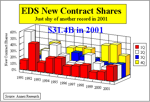 of EDS Fourth Quarter 2001 Business Results What “Recession?” PHOENIX, Feb. 8 - You’d think they are playing in different leagues, if not competing in entirely different sports. The two top IT services companies’ fourth quarter report cards are as different as night and day. At IBM, most charts point south. At EDS, most point north. At IBM, declining in single digits is considered “goodness.” That’s because the recession-driven economy and the industry are doing worse by comparison, we are told. That’s hogwash. For, at EDS, growing in low double digits is considered not good enough by its ambitious management. So they’ve boosted their sales force by 50% in the fourth quarter to bolster future growth. At IBM, a supposed recession is an excuse for lack of growth. At EDS, “what recession?” - would sum up its latest report card, released after the markets closed on Feb. 7. The fourth quarter EDS revenues were a record $5.9 billion, up 13% from a strong year-end finish in 2000. The corresponding earnings were up 16%, adjusted for various one-time factors. For the full year 2001, EDS grew by 12% despite the declining revenues at GM, a major client, and at A.T. Kearney, its consulting unit (its “base” revenue was up 17%). The corresponding net profit surged by 19%.
