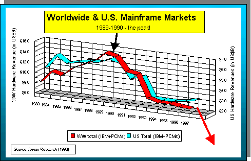 Or when we said in the same March 1990 Annex Bulletin that by the end of the decade, the IT services companies would be at the top of the food IT industry’s food chain, and the all-powerful Japanese would be in trouble (see the chart). Or when we wondered at the IBM annual meetings at the height of another IBM omnipotence era (in 1983-1984), why “IBM Is Mortgaging Its Future?” (see Annex Computer Report, Mar. 1983), using some $35 rent-to-purchase conversions as its white rabbit of the day. Or when we questioned the IBM chairman at the 1997 IBM annual meeting in Dallas why he was similarly using stock buybacks to create an “illusion of prosperity?” (see Stock Buybacks Questioned: Is IBM Mortgaging Its Future Again?, 97-18, 4/29/97). Or when Dennie Welsh and yours truly practically had to drag the then IBM new leaders (Lou Gerstner and Jerry York - in their first year on the job), kicking and screaming away from their hardware infatuation, and into realizing that the name of the game for the 1990s will be IT services (see “ISSC: A Model Operation,” Annex Bulletin 94-06, Jan. 1994). Here’s an excerpt: “So, should ISSC be a role model for IBM