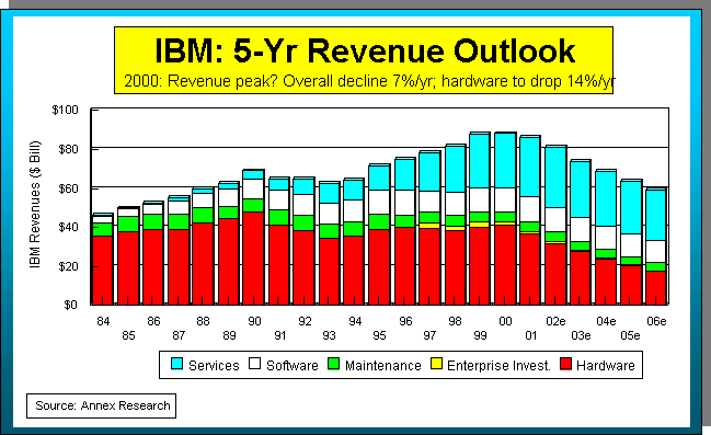 Forecast As for our detailed segment-by-segment forecast, they say “picture is worth a thousand words.” Our charts and tables do not paint a pretty picture. They assume, of course, that IBM does nothing dramatic, but rather follows the course that the Gerstner administration has proudly set for the company (before Sir Lou bailed out, of course). We expect the overall IBM revenue to decline at a compound annual rate of 7% during the next five years. This compares to a 2.5% compound annual growth in the last five years, with $88.4 billion in 2000 being the peak.