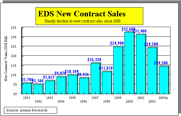 7% decline in GM business. But the revenues would have dropped 2% as reported, prior to the new EITF-00-21 accounting rule[1]. Furthermore, the 2004 revenue may decline by at least $1.4 billion unless EDS recharges its sales engines and reverses its declining new contracts record. The new contract signings for the first nine months were down 41% ($9.7 billion vs. $16.4 billion).