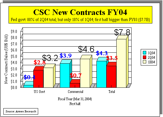 For additional Annex Research reports, check out... 2003: "War Is Great!" (Nov 13), "Less Than Meets the Eye" (May 16), "Back to the Future" (Feb 5) 2002: Analysis of CSC FY02 results (May 17, 2002), "A Disastrous Quarter!" (Apr 17, 2002), “Tough Times, Soft Deals,” (Apr 25, 2002) A selection from prior years: Analysis of CSC calendar 2000 results (Mar 26, 2000), CSC's FY2000 Business Results (May 10, 2000), Business Is Humming Nicely (Nov 3, 2000), CSC 3Q2K, CIO Survey (Feb. 29, 2000), CSC: A Mouse That Roars? (Nov 1998)
