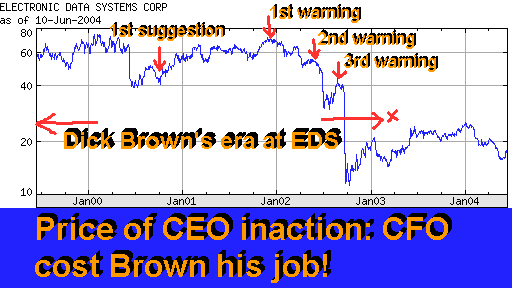 It was a victory of sorts for us, but a hollow one in the end.  The "EDS Story" is a textbook example of a CEO who didn't have the courage to cut the chord that tied him to a CFO who did not know how to manage Wall Street's expectations.  Which means he lacked marketing skills.  Ultimately, the CFO's ineptness cost them both their jobs.