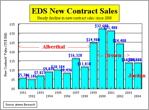 Alarmed by such developments, we issued several warnings about it.  Assured by the then CFO Jody Grant and other senior executives that all was well, Wall Street ignored the warnings.  Until late October, that is.  When EDS published its third quarter results, it suddenly dawned on its investors what we had been saying for months - that the company's sales were slumping, and the revenue and profits would soon follow, too, if the trend were to continue.