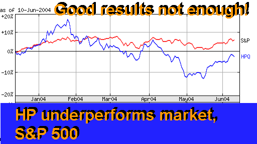 Our three decade+-experience with boardroom and Wall Street relationships suggests that when things like that happen, it is usually because the company's CFO and investor relations people failed to do a good marketing job on Wall Street.  Whether or not that's the case at HP, we'll leave to Fiorina do decide (see the chart, Strong Finish Not Enough, Nov 2003, and HP: Still No Cigar, Feb 2004 - for some reasons the HP stock has been under performing the market).