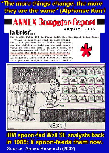 In the early 1980s, for example, IBM duped almost everybody, especially Wall Street, by what we called its "Great Lease Base Sale" strategy.  The move  inflated revenues and profits and masked Big Blue's weaknesses.  So we took IBM to task over it.  Here's an excerpt from our April 1983 Annex Computer Report: