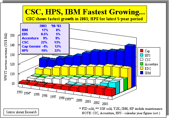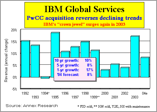 For additional Annex Research reports, check out... 2004: "Cap Gemini: Another, Smaller Loss" (Feb 2004); "CSC: Good Quarter Gets Boos" (Feb 2004); "Hot Air Jordan" Flaunts Flop as Feat (Feb 2004); "Cronyism Is Alive and Well at EDS" (Jan 2004); "Five Most and Least Likely Forecasts for 2004" (Jan 2004) 2003 IGS: "IBM OnDemand: Different Strokes for Different Folks" (Dec 2003); "Investing in Growth" (Apr 2003) 2003 IBM: "IBM vs. HP: Spinning Global Server Market Shares" (Nov 2003); "Finally Heard, Part II," (Nov 2003), “Small Is Now Big at Big Blue” (Oct 16), “On the Nose But No Cigar” (July 16), “A Paler Shade of Blue” (June 2), “Save, Spend and Split” (May 8), “Shrunk by the Marketplace” (Apr 17), “Turnaround Continues...” (Apr 15), "Finally Heard!" (Jan 29), “Start of a Real Turnaround?” (Jan 17). 2002 IGS: "Half or Double Trouble?" (Aug. 12, 2002), "IBM to Take $500M Charge" (Sep 3, 2002), IBM-PwCC Update (Oct 2, 2002), Analysis of IBM Second Quarter Results (July 17, 2002), IBM Layoffs Confirmed! (Aug 14, 2002), Analysis of IBM Third Quarter Results (Oct 16, 2002), Boom Amid Gloom and Doom (Oct 10, 2002) 2002 IBM: “Gerstner: The Untold Story” (Dec 27), "Gerstner Spills the Beans" (Dec 13), "On a Wing and a Prayer" (Oct 21), "IBM-PwC Tie the Knot" (Oct 2), Big Blue Salami (June 19), "Looming IBM Layoffs" (May 14), "IBM 5-Yr Forecast: From Here to Eternity?" (Apr 2002), “Tough Times, Soft Deals,” (Apr 25, 2002), “Gerstner’s Legacy: Good Manager, Poor Entrepreneur” (Jan 2002), IBM Pension Plan Vapors: Where Did $17 Billion Go? (Mar 2002), "Sir Lou OutLayed Lay!" (Apr 1, 2002). A selection from prior years: Is IBM Cheating on Taxes, Annex Bulletin 99-17 (May 1999), IBM 5-year Forecast 2001: An Unenviable Legacy (June 2001), "Break Up IBM!" (Mar. 1996), Fortune on IBM (June 15, 2000), “Smoke and Mirrors Galore,” July 2000), "Slam Dunk of Bunk" (Jan 2000), Annex Bulletin 98-14 ("Wag the Big Blue Dog"), Armonk's Fudge Factory (Apr. 9, 1999), Where Armonk Meets Wall Street, Greed Breeds Incest (November 1998), Stock Buybacks Questioned: Is IBM Mortgaging Its Future Again?, 97-18 (4/29/97), "Some Insiders Cashed In On IBM Stock's Rise, Buybacks" 97-22, 7/27/97, Djurdjevic’s Forbes column, "Is Big Blue Back?," 6/10/97; “Executive Suite: How Sweet!,” (July 1997), "Gerstner: Best Years Are Behind", Aug. 10, 1999), "IBM's Best Years Are 3-4 Decades Behind Us" (July 1999), "Lou's Lair vs. Bill's Loft" (June 1999), "Corporate Cabbage Patch Dolls," 98-39, 10/31/98; Djurdjevic’s Chronicles magazine October 1998 column, "Wall Street Boom; Main Street Doom", “Louis XIX of Armonk,” (Aug. 1996), "Mountain Shook, Mouse Was Born" (Mar. 25, 1994), “A Nice Guy Who Lost His Compass” (Jan 26, 1993), “Akers: The Last Emperor?” June 1991), Industry Stratification Trend (Mar. 30, 1990), etc.]