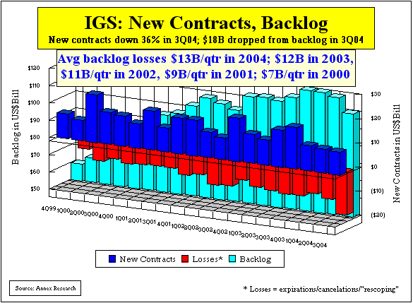 Nor is this just a one-time disappointment. For the first nine months of 2004, they new contract signings were also down - 40%. As a result, the IGS backlog is now $10 billion lower than at the start of the year, having dropped $8 billion in the latest period alone. Which means that $18 billion of the IBM backlog disappeared in various cancelations/expirations/ ”rescopings” during the third quarter – a record decline, compared to $13 billion per quarter average losses this year, and $7 billion only four years ago (see the chart).