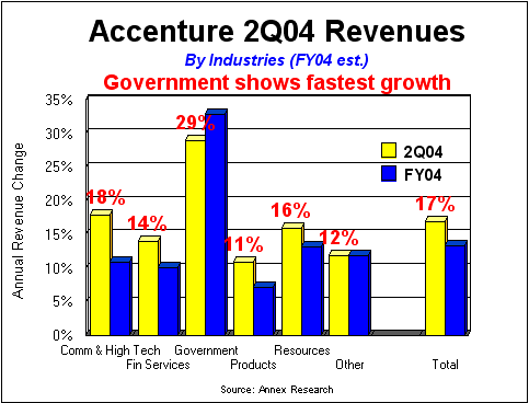 For the first time since the company went public in 2001, ALL of Accenture's industry segments reported double-digit growth. As with all major IT services vendors in these days of a global war economy, Accenture's government business grew the fastest, surging by 29% in the latest quarter. For the full year, we expect it to increase by 33%. The total second quarter revenues jumped by 17% to $3.3 billion. For the full fiscal year 2004, which ends Aug 31, we expect Accenture to grow its business by 13%, to about $13.4 billion.