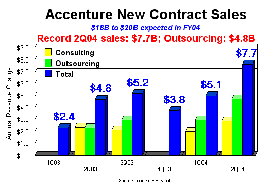 The quarterly new contract sales record of $7.7 billion was actually a double whammy. Both consulting and outsourcing operations were up sequentially from the first quarter. Consulting grew by 40% - from $2.1 billion to $2.9 billion, while outsourcing surged by 60% - from $3.0 billion to $4.8 billion. Obviously, this bodes well for Accenture's revenue growth in the future. What's especially significant is that consulting, its biggest segment (about 61% of revenues), is now returning to growth after several years of stagnation or contraction. So you'd think the stock market would applaud the results? Well, it did, for a change, but ever so tepidly. The company's stock was up in morning trading today by just over 1%. Such a reaction to stellar business results was even less understandable if one considers Accenture's improved profitability and cash flow. For the first six months of the fiscal year 2004, the company's net profit surged by 21% to $297 million. And the outlook for the second half is even better. Great Cash Flow Performance As for cash flow, perhaps the best measure of the soundness of an IT services firm's operations, Accenture had a free cash flow of $885 million during the first six months of fiscal 2004, up 66% over the corresponding period a year ago ($533 million). For the full year 2004, the company expects its free cash flow to be in the range of $1.3 to $1.5 billion. Just to put things into perspective, IBM's 2003 cash flow was $1.7 billion. Two thousand and three was a very good year for IBM. IBM's cash flow the year before was a negative $400 million. IBM is an $89 billion-company. Accenture is a $12 billion company (as of 2003). IBM is a cash-consuming business. Accenture is a cash-generating machine. And now, keeping all that in mind, consider the following stock market indices. IBM's (trailing) price/earnings ratio is 21.2. Accenture's is 21.8, i.e., virtually the same. Even the lowly EDS has a forward P/E of 20!? Does that make any sense? If it does, maybe you can also explain wasting money is better than making money? We can't... By the way, we did not mean to single out IBM for this kind of a comparison. None of the top IT services competitors come even close to Accenture when it comes to generating cash. Some are downright burning it (see EDS: "Hot Air Jordan" Flaunts Flop as Feat, Feb 2004). We merely picked IBM because of its awesome size - to illustrate that one must never confuse quantity (IBM) with quality (ACN). U.S. Returns to Growth Perhaps the most encouraging news for Accenture shareholders who still pay attention to business fundamentals instead of the Wall Street Casino vagaries, is that the company's U.S. business is once again building up steam.