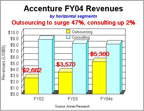 As a result, we expect outsourcing to end up at $5.3 billion by the end of the fiscal year 2004, a 47% jump from the year before. Consulting revenues will also rise, although more modestly (up 2% - see the chart). Outlook Logical thinkers may have already concluded what the outlook for Accenture is: Blue skies are ahead once again. Indeed. The company seems to be firing on all cylinders and is burning the track while some of its major rivals are wasting time figuring out where to get cheaper spare parts for their sputtering engines. For our detailed forecast, click here to view the table. Well, isn't that a splendid time for the CEO of such a fine-tuned enterprise to... well, step down? No kidding! Accenture also announced this morning that its CEO, Joe Forehand, will vacate this position on September 1, making room for a new CEO who is to be named probably next month. Talk about leaving on a high note, huh? That's another point of distinction between Accenture and IBM leaders. One had class; the other crass (see "Gerstner's Legacy," Jan 2002; Gerstner: The Untold Story, Dec 27, 2002); The Book: Gerstner Spills the Beans, Dec 13, 2002). Happy bargain hunting! Bob Djurdjevic PHOENIX, April 8 - Accenture's chief