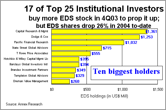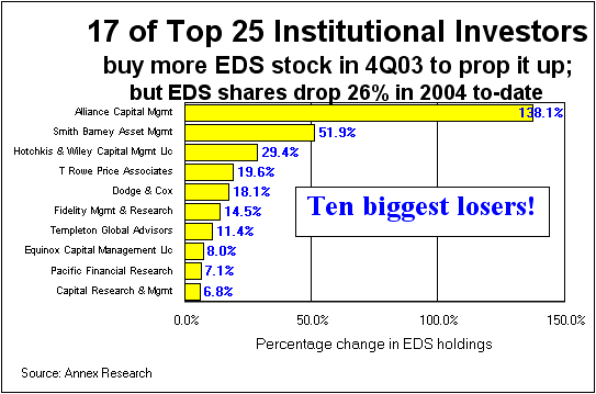 So who are these Wall Street "experts" who evidently use a "on a wink and a prayer"-strategy for their investment bets? Well, the above chart identifies the "ten biggest losers" among the EDS investors. Lead by Alliance Capital and Smith Barney, these institutional investors ignored the warning signs about EDS, as depicted in our reports, "Pain without Gain" (Oct 2003), “Biggest Feather in Cap’s Cap,” (Dec 2003), and "Cronyism Is Alive and Well at EDS" (Jan 2004), among others. They bought instead of selling. And now, they are suffering the consequences.