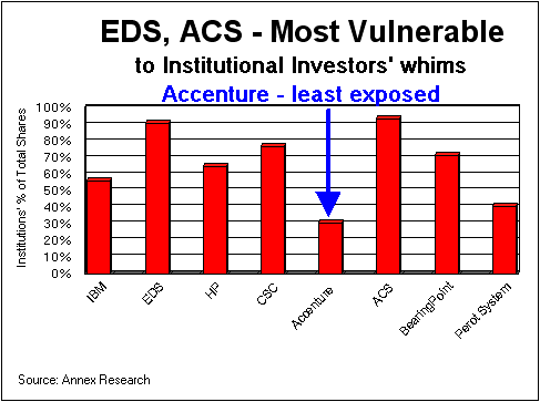 What made EDS particularly vulnerable to institutional investors' whims is their high ownership stake. As we pointed out in our "Hedging the Bets" report (Mar 2004), EDS has the highest (91%) instructional holders' share of the Top 8 IT services firms we analyzed. By contrast, Accenture (31%) and Perot Systems (41%) are the least exposed to Wall Street's mood swings (see the above chart). EDS's first quarter loss, and its continued lackluster sales performance, failed to inspire confidence that its current leaders know which end is up (see EDS endures an anemic quarter, TheStreet.com, 4/27/04). Given that most Wall Street analysts look for guidance from management of the companies they follow before publishing their own forecasts, is there any wonder institutional investors did not know which end was up, either? As usual, Wall Street analysts are closing the barn door after the horse is already gone. Fourteen of 25 analysts that Thompson First Call monitors now have the "sell" or "strong sell" recommendations on EDS. Three months ago, only 10 of them did. A year ago, these analysts' earnings per share estimates were 96% higher than the actual profits/losses turned out to be. Yet they are still seeing blue skies ahead for EDS. Their forecasts for fiscal years 2004 and 2005 are 148% higher than they were 12 months ago. We suppose that's also using EDS Jordan's forecasting methodology of "flaunting flop as feat?" With in-house research like that, is there any wonder institutional investors do not know which end is up, until they realize eventually that the blue sky they were seeing was actually painted on a creaky floor? Moody's in the Mood to Reduce EDS to Junk? Moody's seems to be in the mood to reduce EDS' credit rating to junk level, according to a Reuters report published after the markets closed on Friday April 30. In the last two months, S&P and Fitch Ratings have both already cut EDS' rating to just one notch above junk. Now, with the company's first quarter red ink still not quite dry, and its negative cash flow continuing, Moody's downgrade could be a stinger for the company's stock and bonds. Perhaps anticipating a negative reaction by the debt watchers, the EDS Chief Executive Michael Jordan told the Wall Street analysts in February a downgrade would not be "fatal," but would be "inconvenient." Well, it remains to be seen just how "inconvenient" it really is. Which self-respecting Fortune 500 CEO would sign off on a large new outsourcing deal with a provider whose credit-rating is at junk level? It seems to us that the company's already disappointing new contract sales may take another dive if Moody's mood turns out to be as glum as Reuters suggested today.