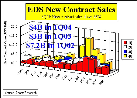 For additional Annex Research reports, check out... 2004 IT Services: EDS: On a Wink and a Prayer (Apr 2004); HPS Wins by a Nose! (Octathlon 2004); Accenture: Burning the Track (Mar 2004); IGS: "Crown Jewel" Restored? (Mar 2004); HP: Still No Cigar (Feb 2004); Cap Gemini: Another, Smaller Loss (Feb 2004); CSC: Good Quarter Gets Boos (Feb 2004); EDS: "Hot Air Jordan" Flaunts Flop as Feat (Feb 2004); IT Industry: Whither Goeth It? (Jan 2004); Cronyism Is Alive and Well at EDS" (Jan 2004) 2003 EDS: “Biggest Feather in Cap’s Cap,” (Dec 2003); "Pain without Gain" (Oct 2003), "EDS CEO Replaced" (Mar 2003); Rebuilding Trust and Confidence (Feb 2003)2002 EDS: Wall Street Legal Vultures Descend Upon EDS (Sep 27, 2002), EDS Issues Earnings Warning (Sep 18, 2002), Wall Street-Main Street Chasm Widens (July 3, 2002), Analysis of EDS 4Q01 Results (Feb 8, 2002)A selection from prior years: Annex Research Analysis of EDS 4Q00 Results (Feb 7, 2001), EDS Takes Over US Navy (Oct. 10, 2000), EDS Second Quarter Results (July 28, 2000), Annex Bulletin - 2000-02 (EDS' e-Price Clubs).