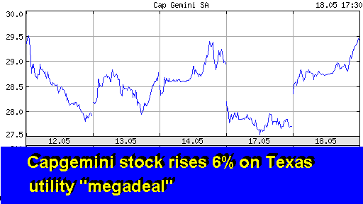 PHOENIX, May 18 - The state of Texas has always prided itself on bigness.  Now a Paris, France-based company can claim a Texas-size home run.  Capgemini announced this morning that it has signed a $3.5 billion 10-year services deal with TXU Corp., a Texas power company.  In response to the news, Capgemini shares surged by six points on the Paris Bourse today (see the chart below).