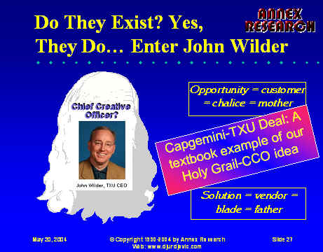 Evidently, John Wilder wouldn't have had any doubts.  So is this native Missourian, a magna cum laude graduate from Southeast Missouri State University, with a master's degree conferee from the University of Texas at Austin, the epitome of a new breed of visionary CEOs that we dubbed "Chief Creative Officers" in the above Holy Grail piece?