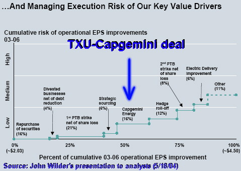 Well, a key component was Capgemini Energy Limited, a new company being formed by Capgemini and TXU as the center-piece of a $3.5 billion joint venture.  Its mission will be not only to take over more than half of TXU's Selling General & Administrative (SG&A) expenses (about $450 million per year), and shave off some $175 million from it in 2005, relative to 2003 levels.  The new partnership will generate its own revenues and profits by selling its business process (BPO) and classical (ITO) outsourcing services to other U.S. utility companies, as Capgemini's exclusive channel.