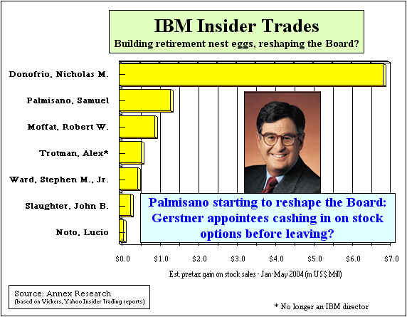 A SPECIAL ANNEX NEWSFLASH Analysis of IBM Insiders' 2004 Trades Changing of the Guard Palmisano Reshaping the Board; Some Executives Building Retirement Nest Eggs? PHOENIX, May 28 - A change of the guard is quietly under way at Armonk. Two years into his tenure as IBM's top executive, Sam Palmisano is starting to make his mark on Big Blue's Board and culture. He has added three new directors. He has changed the rules under which stock options are exercised (see IBM: Greed De-clawed?, Feb 2004). And he has just put his money where his mouth was. Earlier this week, he acquired 40,984 IBM shares exercising his $18.66 stock options granted in 1995.