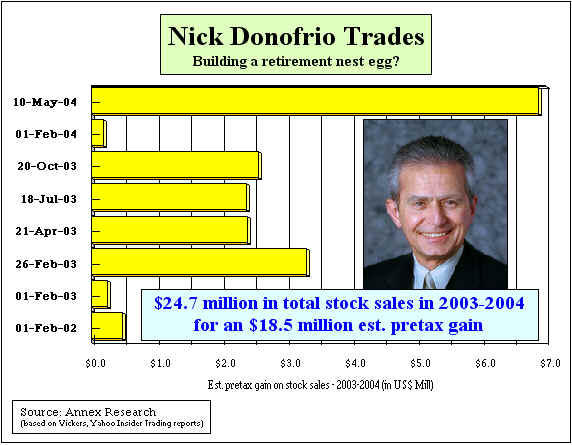To be fair, we should point out that Palmisano also sold nearly a half (19,674) of those shares at $87.20 apiece, yielding just over $1.7 million and an estimated pretax gain of about $1.35 million. (The company said he did it to cover the exercise price and the taxes). But Palmisano KEPT the other half. And that's something that hasn't been done in any discernible by any IBM executive ever since the former IBM CEO Lou Gerstner ushered the "Era of Greed" into Armonk circa 1996 (see "Some Insiders Cashed In On IBM Stock's Rise, Buybacks", May 1997, “Executive Suite: How Sweet!,”, July 1997, "Gerstner: Best Years Are Behind", Aug, 1999). IBM executives sold gobs of Big Blue stock acquired at heavily discounted stock options prices, but scant few of them kept any of it in the last eight years - hardly a vote of confidence in the company whose bright future they were plugging publicly. But while Palmisano is starting to accumulate the shares of the company he leads, some IBM executives seem to be building their retirement nest eggs, and some Gerstner Board appointees (e.g., Alex Trotman, John Slaughter, Lucio Noto) are cashing in on stock options - in preparation for departure? (see the chart). Nick Donofrio, for example, a senior VP in charge of technology and manufacturing, stands out for his insider trades in the last 17 months.