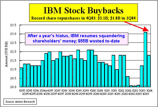 For additional Annex Research reports, check out... 2004 IBM/IGS: Going Retro with Mainframes (Apr 8); IBM: Five-year Forecast (Apr 8); Mainframe at 40! (Apr 2); "Crown Jewel" Restored? (Mar 2004); IBM: Greed De-clawed? (Feb 2004); Hype Exceeds Results (Jan 2004); "Five Most and Least Likely Forecasts for 2004" (Jan 2004)2003 IGS: "IBM OnDemand: Different Strokes for Different Folks" (Dec 2003); "Investing in Growth" (Apr 2003) 2003 IBM: "IBM vs. HP: Spinning Global Server Market Shares" (Nov 2003); "Finally Heard, Part II," (Nov 2003), “Small Is Now Big at Big Blue” (Oct 16), “On the Nose But No Cigar” (July 16), “A Paler Shade of Blue” (June 2), “Save, Spend and Split” (May 8), “Shrunk by the Marketplace” (Apr 17), “Turnaround Continues...” (Apr 15), "Finally Heard!" (Jan 29), “Start of a Real Turnaround?” (Jan 17). 2002 IGS: "Half or Double Trouble?" (Aug. 12, 2002), "IBM to Take $500M Charge" (Sep 3, 2002), IBM-PwCC Update (Oct 2, 2002), Analysis of IBM Second Quarter Results (July 17, 2002), IBM Layoffs Confirmed! (Aug 14, 2002), Analysis of IBM Third Quarter Results (Oct 16, 2002), Boom Amid Gloom and Doom (Oct 10, 2002) 2002 IBM: “Gerstner: The Untold Story” (Dec 27), "Gerstner Spills the Beans" (Dec 13), "On a Wing and a Prayer" (Oct 21), "IBM-PwC Tie the Knot" (Oct 2), Big Blue Salami (June 19), "Looming IBM Layoffs" (May 14), "IBM 5-Yr Forecast: From Here to Eternity?" (Apr 2002), “Tough Times, Soft Deals,” (Apr 25, 2002), “Gerstner’s Legacy: Good Manager, Poor Entrepreneur” (Jan 2002), IBM Pension Plan Vapors: Where Did $17 Billion Go? (Mar 2002), "Sir Lou OutLayed Lay!" (Apr 1, 2002). A selection from prior years: Is IBM Cheating on Taxes, Annex Bulletin 99-17 (May 1999), IBM 5-year Forecast 2001: An Unenviable Legacy (June 2001), "Break Up IBM!" (Mar. 1996), Fortune on IBM (June 15, 2000), “Smoke and Mirrors Galore,” July 2000), "Slam Dunk of Bunk" (Jan 2000), Annex Bulletin 98-14 ("Wag the Big Blue Dog"), Armonk's Fudge Factory (Apr. 9, 1999), Where Armonk Meets Wall Street, Greed Breeds Incest (November 1998), Stock Buybacks Questioned: Is IBM Mortgaging Its Future Again?, 97-18 (4/29/97), "Some Insiders Cashed In On IBM Stock's Rise, Buybacks" 97-22, 5/27/97, Djurdjevic’s Forbes column, "Is Big Blue Back?," 6/10/97; “Executive Suite: How Sweet!,” (July 1997), "Gerstner: Best Years Are Behind", Aug. 10, 1999), "IBM's Best Years Are 3-4 Decades Behind Us" (July 1999), "Lou's Lair vs. Bill's Loft" (June 1999), "Corporate Cabbage Patch Dolls," 98-39, 10/31/98; Djurdjevic’s Chronicles magazine October 1998 column, "Wall Street Boom; Main Street Doom", “Louis XIX of Armonk,” (Aug. 1996), "Mountain Shook, Mouse Was Born" (Mar. 25, 1994), “A Nice Guy Who Lost His Compass” (Jan 26, 1993), “Akers: The Last Emperor?” June 1991), Industry Stratification Trend (Mar. 30, 1990), etc.]